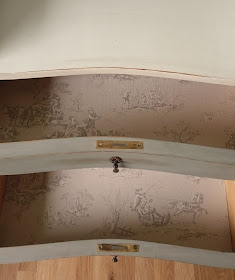 I am not going to bore you with to much details, because it was pretty straight forward. But there is one detailt I want to point out, and that is the delicate wall paper lining I inserted in the drawers and inside the cabinet doors. They had the perfect framed panels for the paper. And it really compliments the dusty blue color of the vanity.